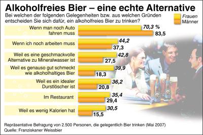 stellte sich heraus, dass nicht nur das klassische Motiv Auto fahren Beweggrund ist, ein alkoholfreies Bier zu trinken. So gönnt sich fast jede zweite Frau (44,2 %) und jeder dritte Mann (37,3 %) ein alkoholfreies Bier, wenn sie noch arbeiten müssen. Und als geschmackvolle Alternative zu Mineralwasser wird es von fast der Hälfte der Frauen (42,8 %) und gut einem Viertel der Männer (27,5 %) geschätzt. Fast 40 Prozent der Frauen sind sogar der Meinung, dass alkoholfreies Bier genauso gut schmeckt wie alkoholhaltiges Bier. Diese Ansicht teilt knapp jeder fünfte Mann (18,3 %).