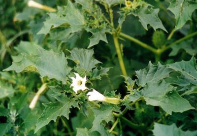 Der Weiße Stechapfel, bzw. Gemeine Stechapfel (Datura stramonium) ist in Mitteleuropa der häufigste Vertreter der Stechapfel-Gattung. Er ist eine buschigwachsende einjährige Pflanze. Der Stängel ist gabelästig und kahl. Die Blätter sind eiförmig, unregelmäßig spitz gelappt bis doppelt gezähnt, weich und etwa handgroß, dunkelgrün an der Oberfläche und graugrün an der Unterseite. Weiterhin kommt der Dornige Stechapfel (Datura ferox) vor. Dessen Früchte haben weniger, dafür jedoch längere Stacheln.